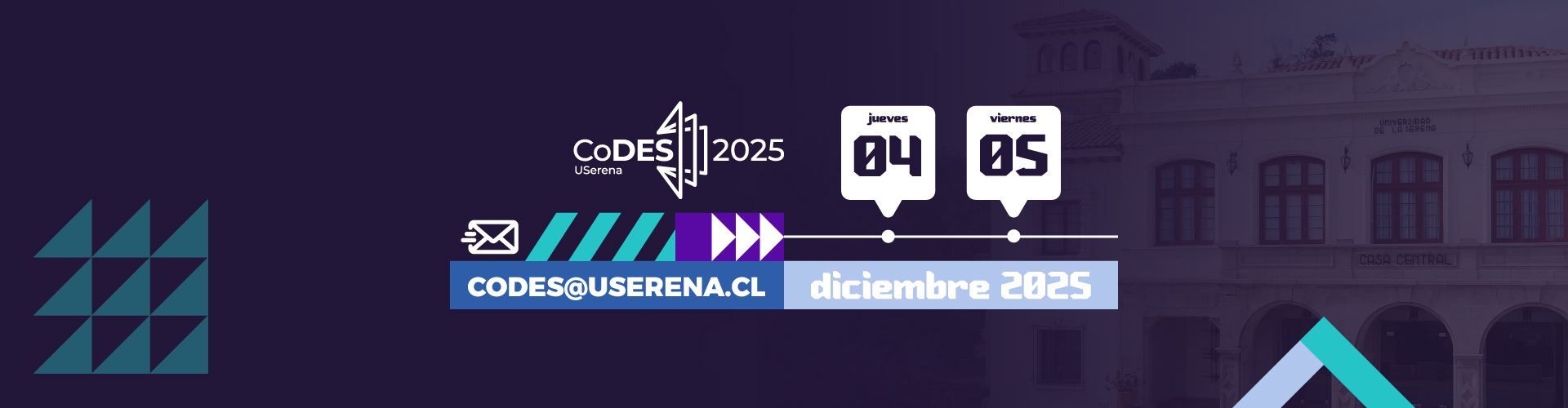 La Universidad de La Serena, por intermedio de la Vicerrectoría de Investigación y Postgrado y la Vicerrectoría Académica, tiene el agrado de anunciar la realización del VII Congreso de Docencia en Educación Superior, CODES 2025-2 que se llevará a cabo los días 4 y 5 de diciembre de 2025.